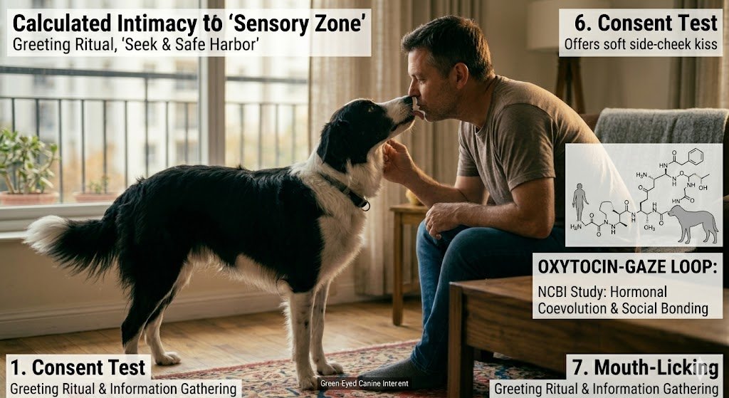 As dogs evolved alongside humans, this “food-seeking” behavior transformed into a ritualized Greeting Gesture. When you lean in for a kiss, your dog’s ancient brain may perceive it as a social “check-in.”