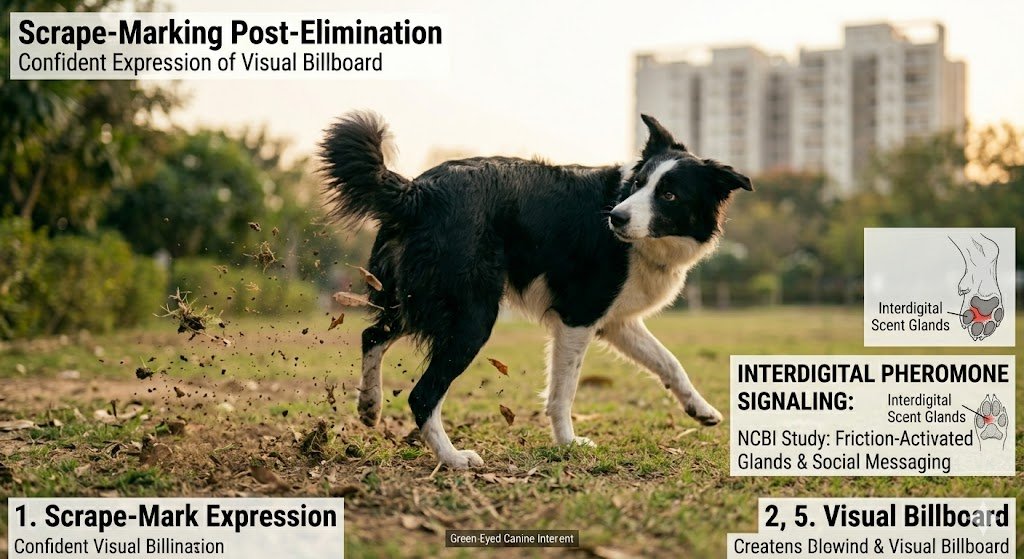 Why Your Dog “Kicks” After Pooping (NLP Snapshot): Kicking after pooping is a form of Dual-Sensory Communication. Dogs utilize Interdigital Scent Glands located between their toes to deposit unique pheromones onto the ground. By kicking, they are performing a “Scrape-Mark” that acts as both a visual and olfactory signpost. This behavior claims territory, advertises social status, and leaves a “biological ID card” that lasts much longer than the waste itself.
