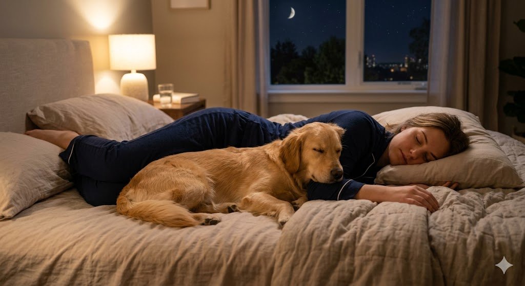 The “Best Friend” Choice (NLP Snapshot): Dogs select a sleeping partner based on a combination of social safety, scent-security, and thermal regulation. They gravitate toward the individual who serves as their “secure base”—the person whose presence physically lowers their heart rate and allows them to enter deep, restorative sleep cycles.
