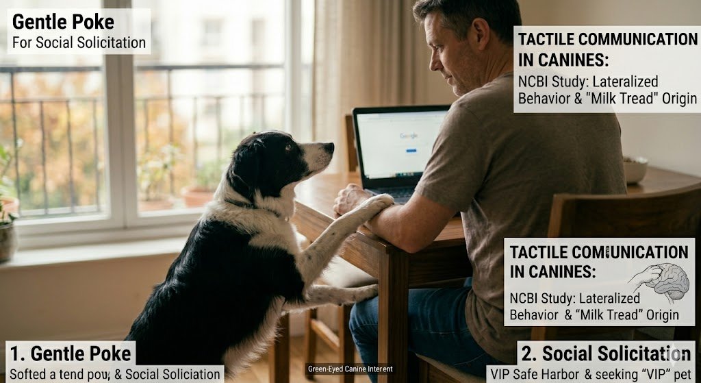 This is a heavy, insistent paw placed firmly on your knee or arm. It often happens when you are eating, or when it is nearing “walkie” time. This is a Demand Signal. The dog is asserting a need for a specific resource (food or the outdoors).